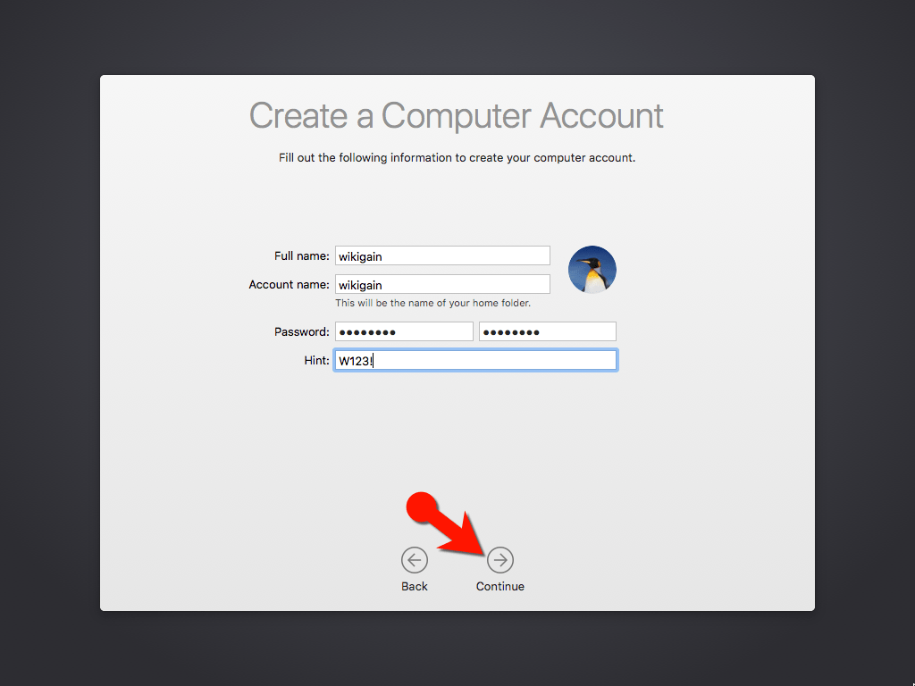 #6. Fill out the Full name, Account name, Password, Hint and check the box of Set time zone based on Current location. Then finally click on Continue to create your user account for macOS High Sierra.